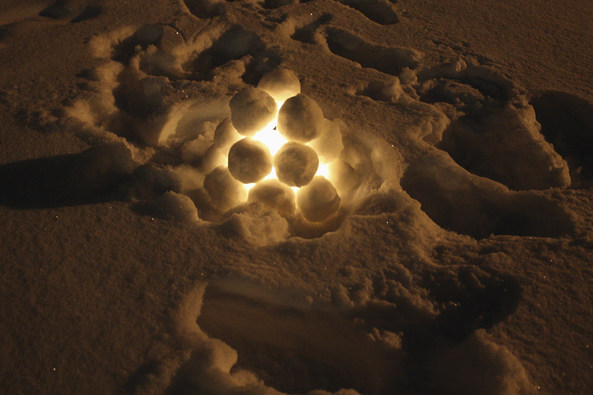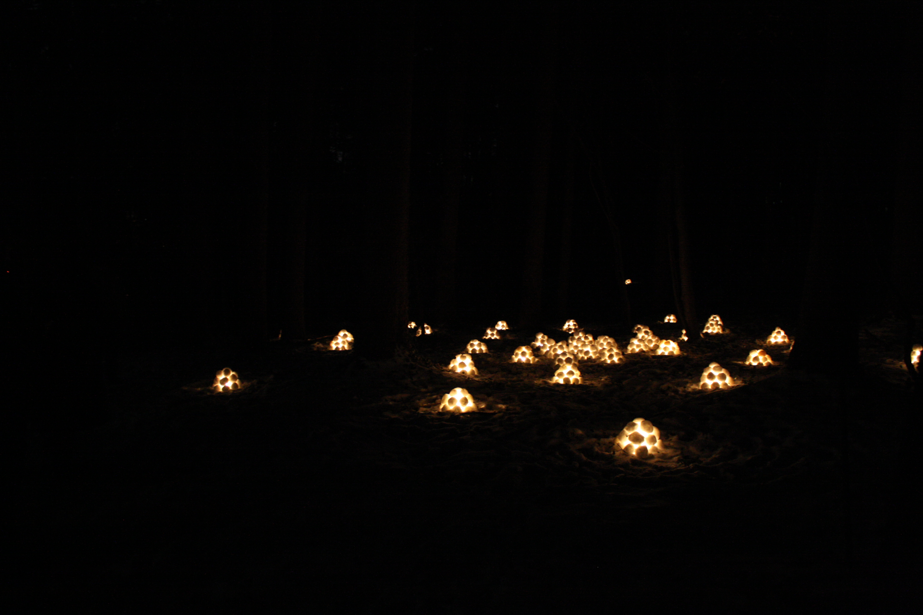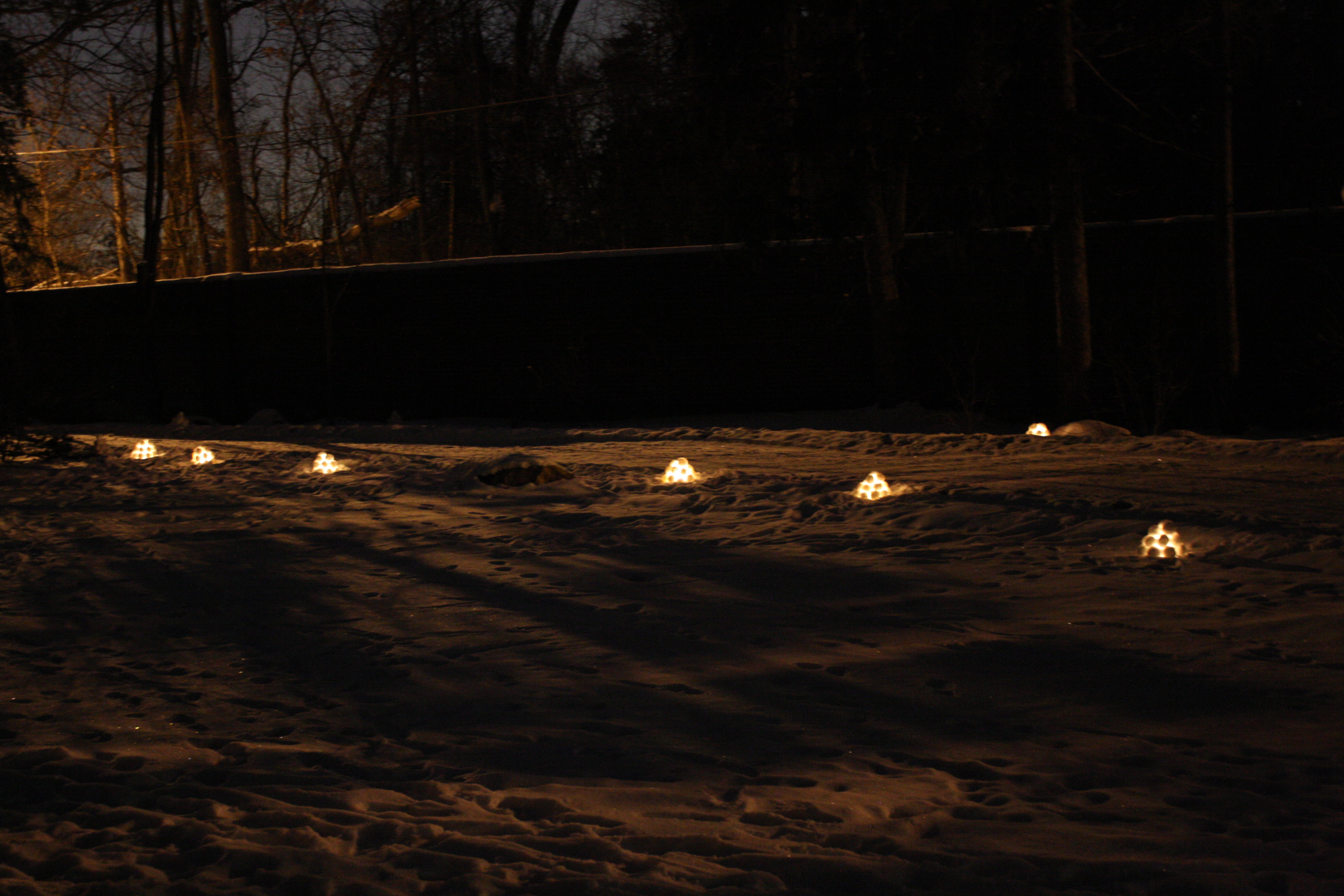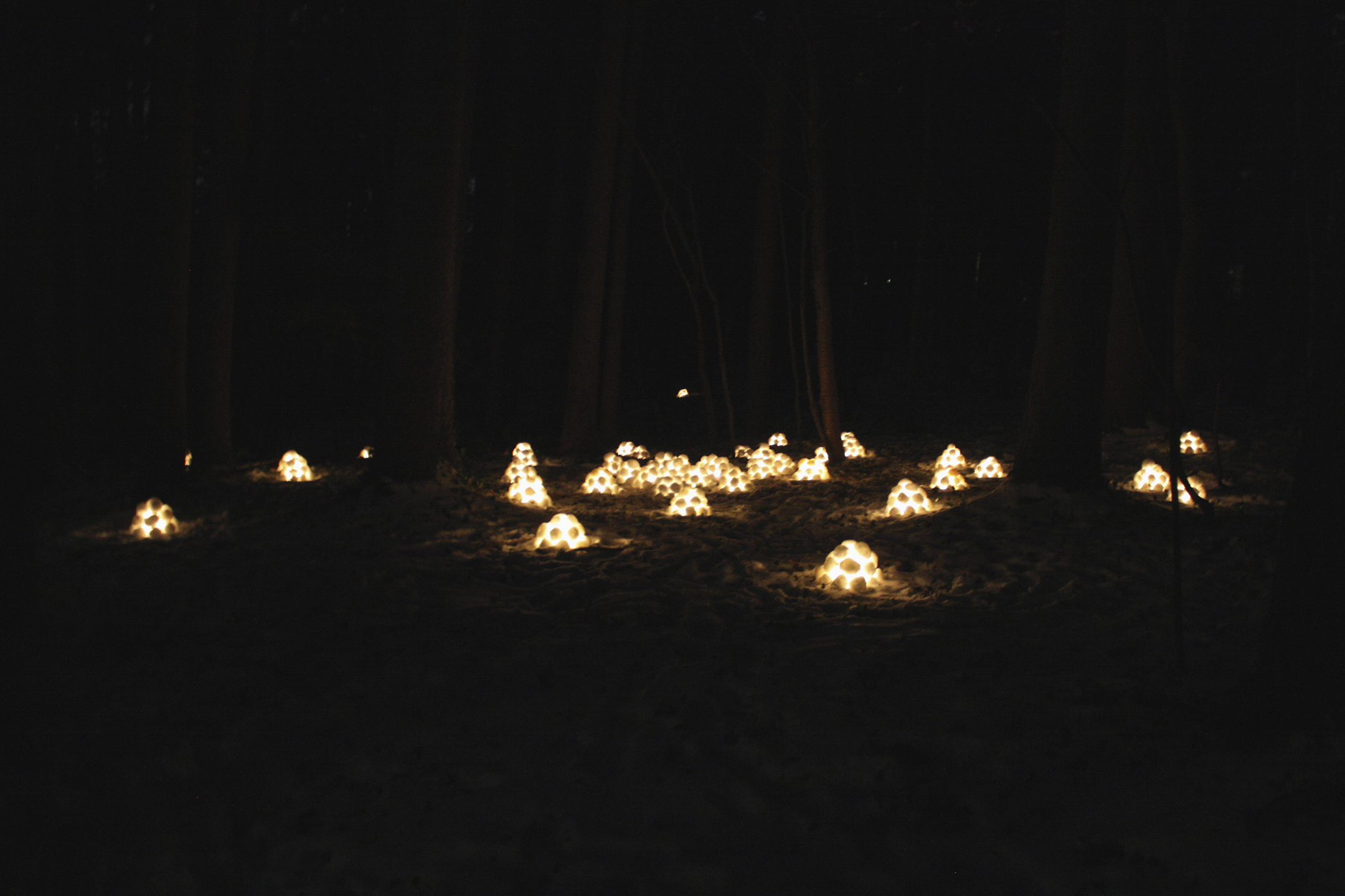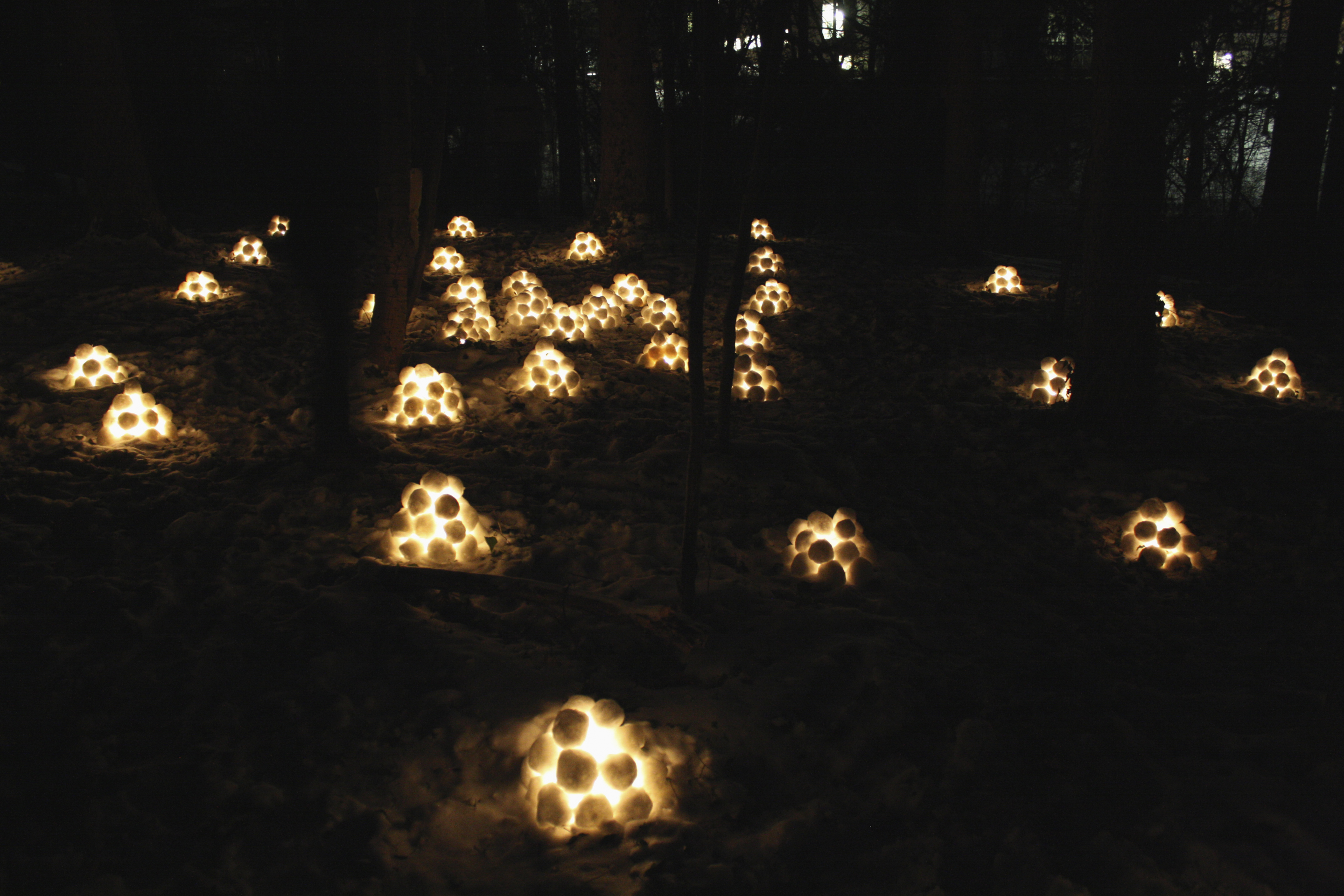 Snowball lanterns were made and installed in the woods. Visitors tread through fresh snow into the Detroit suburban forest following meandering light trails.